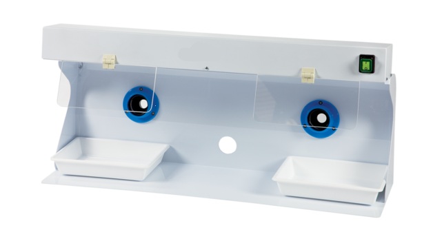 Cappa paraspruzzi compatta e dalle linee essenziali. Abbinata alla pulitrice è adatta per operazioni di pulitura e lucidatura. È costruita in metallo verniciato a polvere antigraffio e anti ruggine. La cappa è predisposta per l'applicazione dell'aspiratore; è, inoltre, dotata di una lampada al neon da 18W orientabile e di schermi protettivi trasparenti ed intercambiabili.